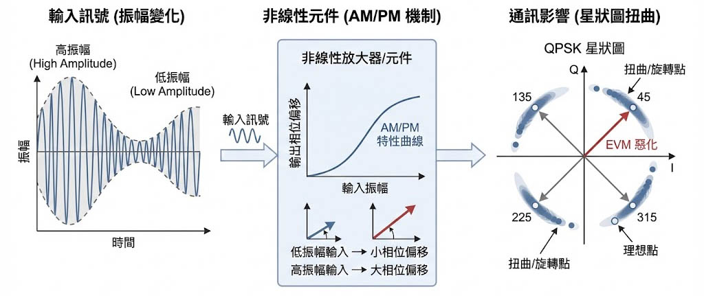 這是一個較常被忽略但同樣致命的現象,當輸入訊號的振幅改變時,不僅輸出振幅會非線性變化,輸出的「相位」也會隨之發生偏移。