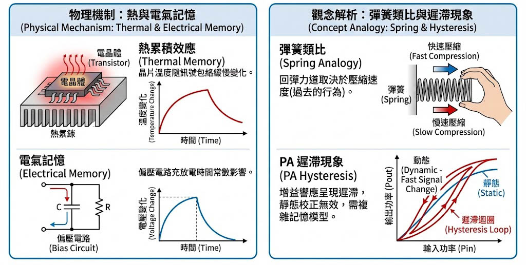 想像一個彈簧,如果你快速壓縮它,它回彈的力道與你慢慢壓縮它是不同的,PA 也是如此,當訊號快速變化時,PA 的增益響應會呈現「遲滯(Hysteresis)」現象,這意味著簡單的靜態校正無法解決問題,必須引入具備「記憶深度」的複雜模型。