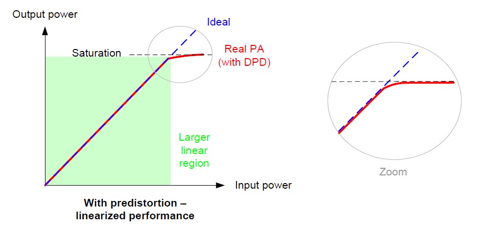上圖說明了 DPD(數位預失真)對功率放大器(PA)傳輸曲線的影響