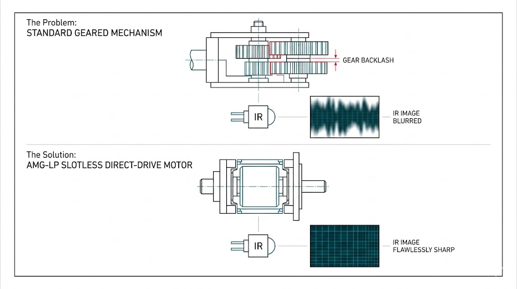 此圖對比了標準齒輪機構存在背隙,導致紅外線影像模糊(上)。而 AMG-LP 無槽直驅馬達則能消除背隙,讓影像完美清晰(下)。