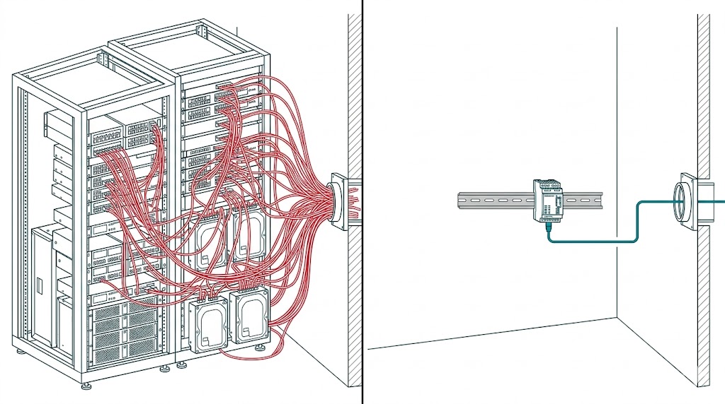 此示意圖對比了傳統大型機櫃配線的複雜(左),與現代緊湊型導軌式模組的簡潔與空間節省(右)。