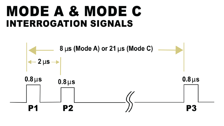 SSR 天線能夠發射不同種類的詢問訊號,以引導飛機做出特定的回應,這些詢問訊號依其模式進行分類;例如,模式 A 用於請求目標的識別碼,模式 C 與其相似,主要由地面站用來請求以 100 英尺為單位遞增的飛機高度,模式 S 則更為複雜,因為它能向目標請求多樣化的資訊,除了脈衝之外,此模式的詢問訊號還包含一個相位調變資料區塊;圖 2 與圖 3 說明了模式 A、C 和 S 詢問訊號之間的差異。