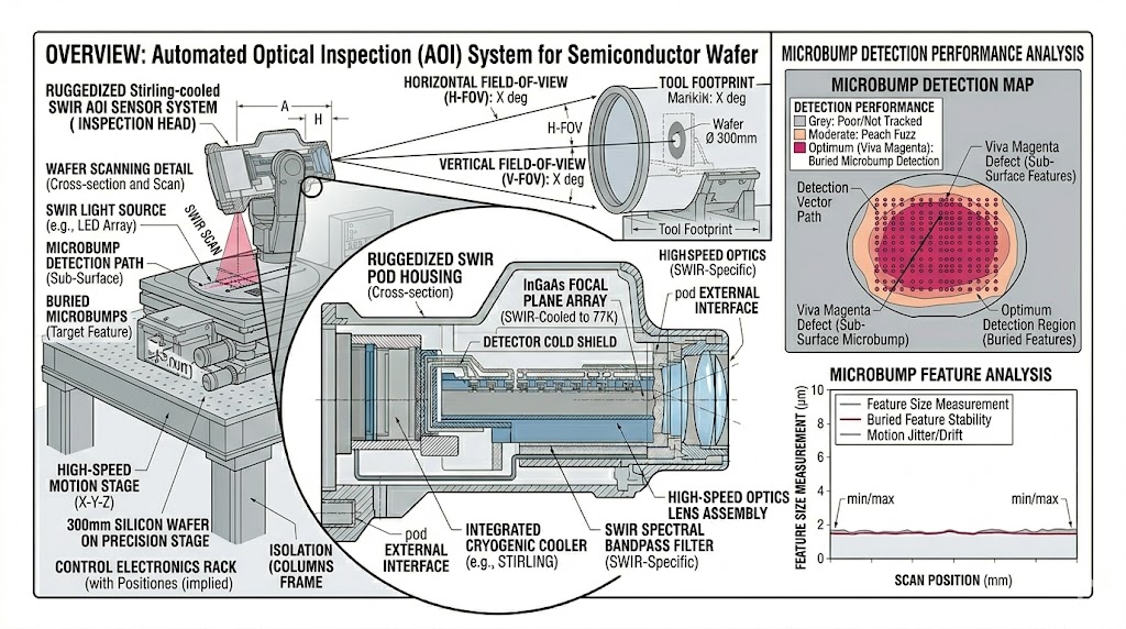 晶圓自動光學檢測 (AOI) 系統示意圖:配備斯特林冷卻短波紅外線 (SWIR) 感測頭與 77K 的銦鎵砷焦點平面陣列,檢測 300mm 晶圓埋入式微凸塊,含性能驗證。