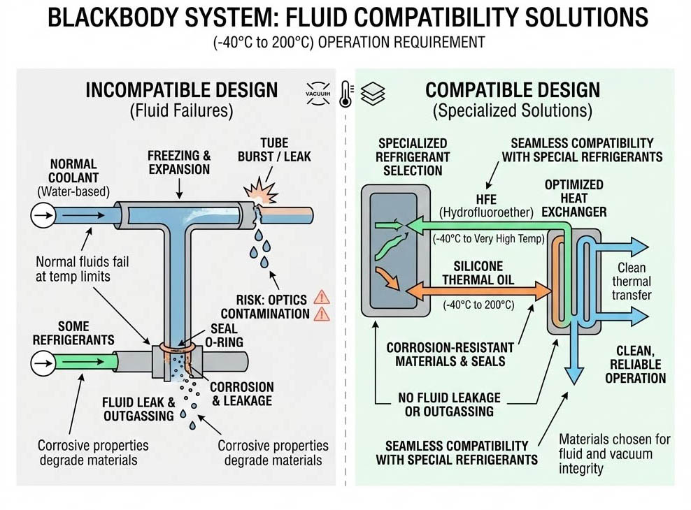 模擬太空環境需要極寬廣的動態溫度範圍(例如從攝氏零下四十度至攝氏兩百度),單純依賴半導體熱電冷卻器(TEC)無法在高真空中排除如此巨大的熱負載,工程實務上,必須將液體冷卻管路引入真空艙內,以帶走黑體基座的廢熱,這裡隱藏著嚴重的流體力學與材料挑戰:在極低溫與高真空下,一般水基冷卻液會結冰膨脹,而某些化學冷媒則可能侵蝕管路密封環,導致冷媒洩漏;在高度潔淨的 T-VAC 艙中,任何微小的釋氣(Outgassing)或液體洩漏都會瞬間污染價值連城的太空光學鏡片;因此,黑體系統的內部管路與熱交換器,必須能無縫相容於多種特殊冷媒(如氫氟醚 HFE 或矽熱油),以因應不同溫度極限的操作需求。