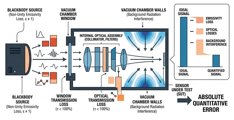 在 T-VAC 測試中,紅外線光子從黑體發出後,往往需要穿過多層光學元件(例如置於艙內的準直儀、濾光片,或是艙壁的紅外透射視窗)才能抵達待測感測器,純粹的光學物理指出,沒有任何鏡片具備百分之百的穿透率;此外,黑體表面本身無法達到絕對完美的發射率(非單一發射率),且真空艙內壁的背景輻射也會產生干擾。