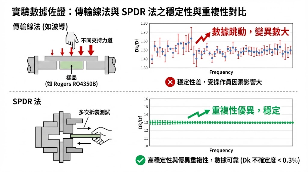 測得的 Dk/Df 數據容易隨操作員夾持力道不同而跳動,且 Df 值在低損耗範圍內變異數大。