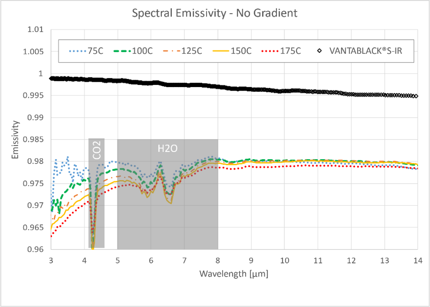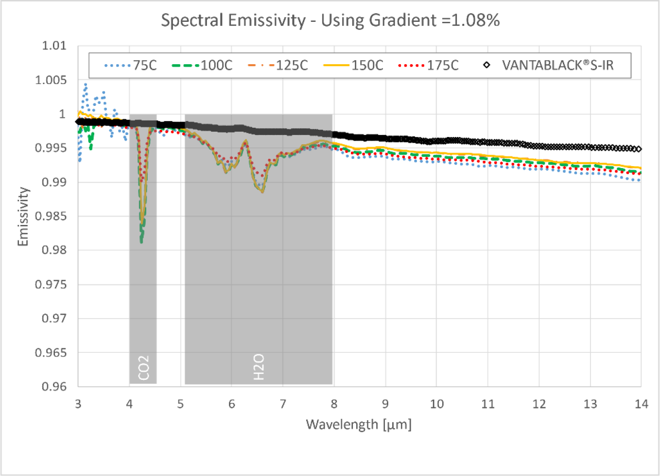 以下將提供兩個採用此校準方法獲得校準結果的黑體實例;第一個是SBIR生產的、塗覆有VANTABLACK S-IR高發射率塗層的黑體,第二個則是一個塗覆有SBIR標準塗層的黑體。對於這兩個黑體,均在175°C、150°C、125°C、100°C和75°C這幾個溫度點採集了校準數據,如前所述,來自所有溫度點的數據被共同分析,並使用相同的初始反射率尺度因子,以推導出一個適用於所有溫度的單一梯度項,一旦這個梯度項被確定下來,便可用於計算每個校準設定點下的實際表面溫度,然後,這個表面溫度再被用於計算在每個校準溫度下的光譜發射率。圖5至圖8展示了在高發射率源和標準源上,在整個溫度範圍內的校準結果,圖中在4.3μm附近以及5μm至8μm之間的特徵,是由於在這兩個相應波段中存在CO2和H2O的吸收峰所致;本次測試可用的乾燥氮氣源未能確保在整個測試期間提供持續穩定的流量,從而導致了上述的吸收假影。在撰寫本文時,相關的設施改進工作正在進行中,預期將能減少這些吸收假影的影響。