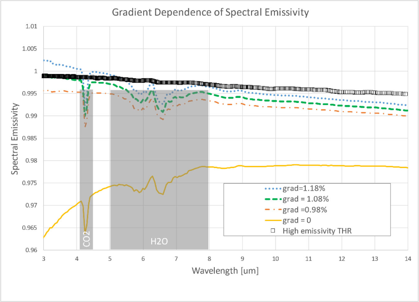 然而,隨著源溫度與環境溫度的差異增大,有效發射率在較短波長處開始發生顯著的變化,例如,當源溫度達到175°C時,在中波紅外波段 (3-5μm) 的有效發射率與其在26°C時的有效發射率相比,差異已接近2%;許多輻射校準程序為了提高訊噪比,特別是在短波段,往往選擇在較高的溫度下進行;如果在上述情況中,一個系統在175°C下進行校準並得到一個有效發射率值,然後再用這個在175°C下得到的有效發射率去推算其在接近環境溫度(例如26°C,即比25°C環境高1°C)下的輻射特性,那麼預期將會產生高達2%的輻射量測誤差。更進一步說,如果該系統在一個與其校準時顯著不同的環境溫度下使用,同樣也會引入額外的誤差。
