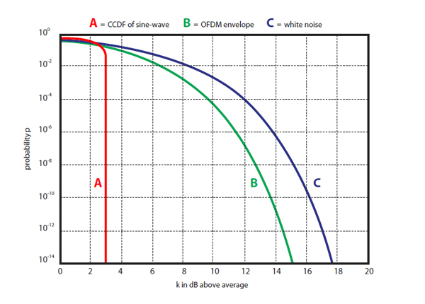 圖 1 展示了一個實際 HDTV、OFDM 調變訊號的 CCDF (互補累積分布函數, Complementary Cumulative Distribution Function),曲線 A 顯示了一個 100% AM (調幅) 調變的正弦波,其 CCDF 呈現「平方化」的態勢,在低機率和高機率下均顯示出 3 dB 的峰均比,這是由於其高度可預測的週期性波形所致;曲線 B 中顯示的 OFDM 訊號,其峰均比約為 15 dB,並且遵循雷利分佈模式;曲線 C 則展示了高斯白雜訊作為參考,理論上其峰均比為無限大,但在此圖中,於 10−12 的機率下顯示約為 17 dB。