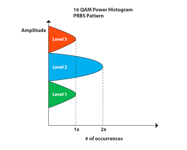 圖 2 說明了一個 16 QAM (正交振幅調變) 調變數位訊號的 PDF (機率密度函數, Probability Density Function),位準 1、2 和 3 代表 16 QAM 訊號的三個不同功率位準,此資料訊號為一個 PRBS (偽隨機位元序列, Pseudo-random Bit Stream) 圖樣,理論上位元值的分布是均勻的;圖 3 則是一個 16 QAM 訊號的星座圖,使用極座標圖示來說明三個不同的功率位準,由於功率位準二有 8 個可能的位元位置,因此其出現次數應為位準一和位準三的兩倍。