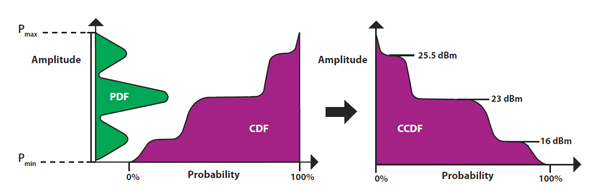 在通訊應用中,通常期望在 CCDF 中檢視最大功率值,如圖 4 所示,這是透過整合 PDF 以產生 CDF (累積分布函數, Cumulative Distribution Function) 來實現,而 CCDF 則是將 CDF 從 1 中減去計算而得 (1 - CDF = CCDF),此分佈圖的最高峰值(出現機率最低)顯示在圖表的左上角。