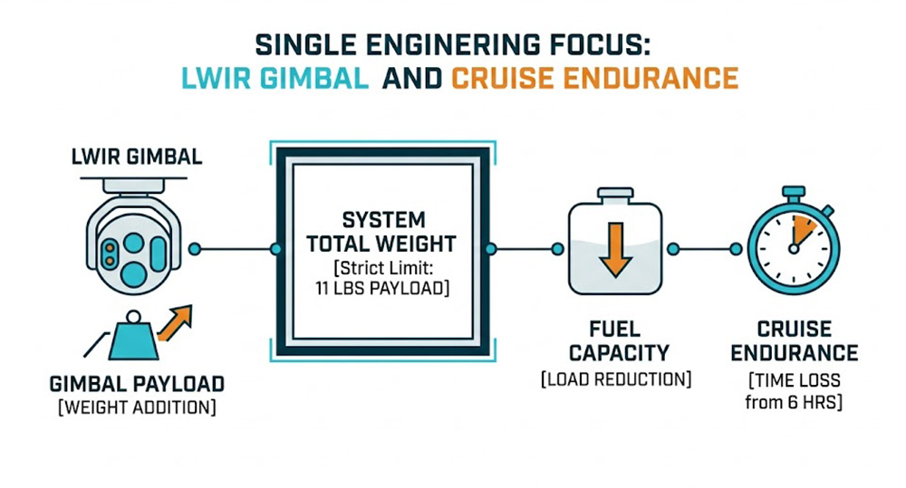 次雲層無人機需在海拔 15,000 英呎的嚴苛環境下執行任務,其大氣密度與溫度的變化會劇烈影響燃油引擎的燃燒效率與電動馬達的散熱,工程師在設計時,必須確保在有限的機體尺寸(如翼展 12 英呎左右)內,將系統總重量與酬載能力(通常被限制在 11 磅左右的嚴格容限內)達到最佳化平衡,任何額外的光電球(如搭載高幀率的 LWIR 微測輻射熱計)重量,都會直接削減燃油攜帶量,進而影響其原本可達 6 小時的長週期巡航指標。