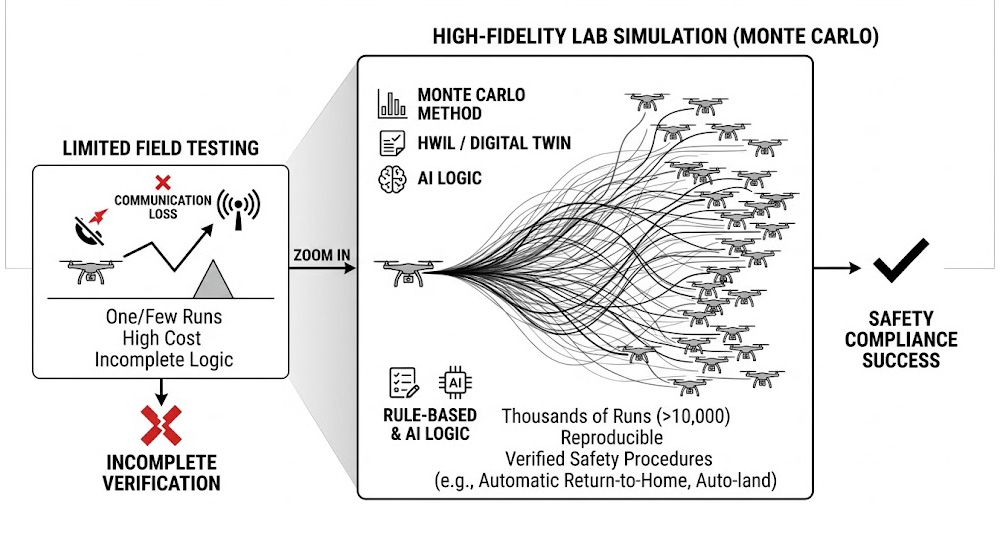 在電子戰(EW)干擾頻繁的戰區,無人機極易遭遇全球導航衛星系統(GNSS)拒止或資料鏈路(Data Link)中斷的情況,因此系統必須內建高度可靠的自主導航演算法,工程師面臨的最大挑戰在於如何驗證這些 Rule-based 或 AI 驅動的自主邏輯,例如:動態路徑選擇、障礙物規避、以及在失去通訊連結時的自動返航與自動降落程序,這些失效安全機制的測試,無法單純依靠實飛驗證,必須在實驗室內透過高擬真的數位雙生或硬體迴路(HWIL)模擬器進行上萬次的蒙地卡羅(Monte Carlo)測試,以確保其符合軍用航空飛行安全法規。