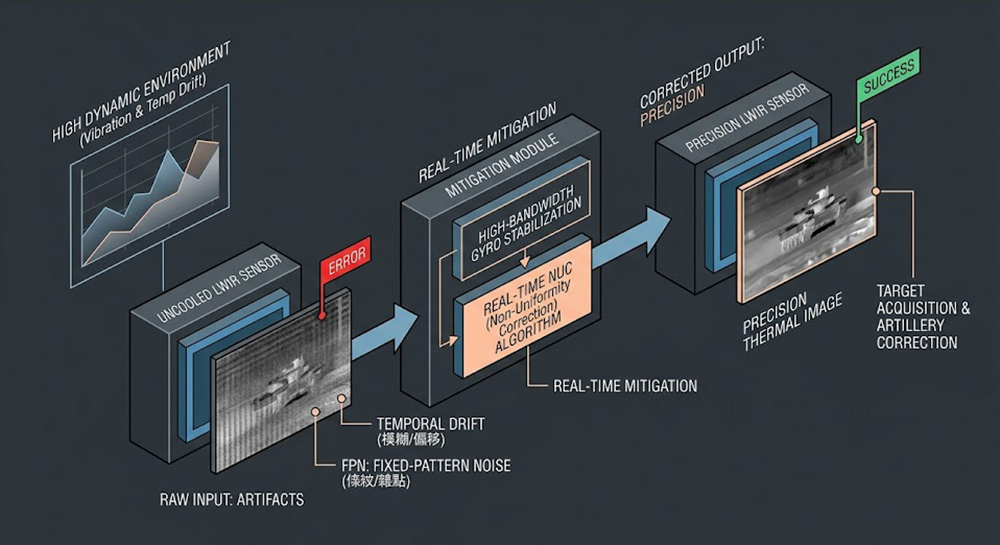 次雲層的氣流極度不穩定,VTOL 與固定翼模式切換時的劇烈震動會直接傳遞至偵察酬載上,非致冷型 LWIR 感測器在面對這類高動態與溫度急遽變化的環境時,極易產生嚴重的時間漂移(Temporal Drift)與固定模式雜訊(FPN),工程師必須確保光電球具備極高頻寬的陀螺儀穩定機制,並結合即時的非均勻性校正(NUC)演算法,以確保下鏈傳輸的熱影像訊號能精準用於目標獲取與火砲校正,而不會因影像偽影導致誤判。