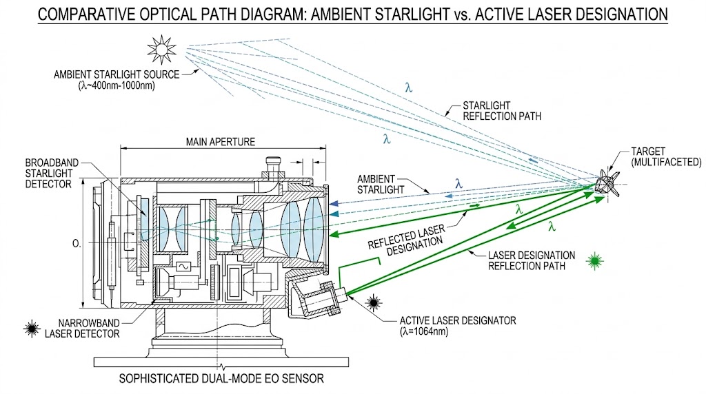 先進雙模電光感測器光路示意圖:環境星光(藍線)與主動雷射標定(綠線)反射自目標,經分離後投射至各自的寬頻與窄頻偵測器。