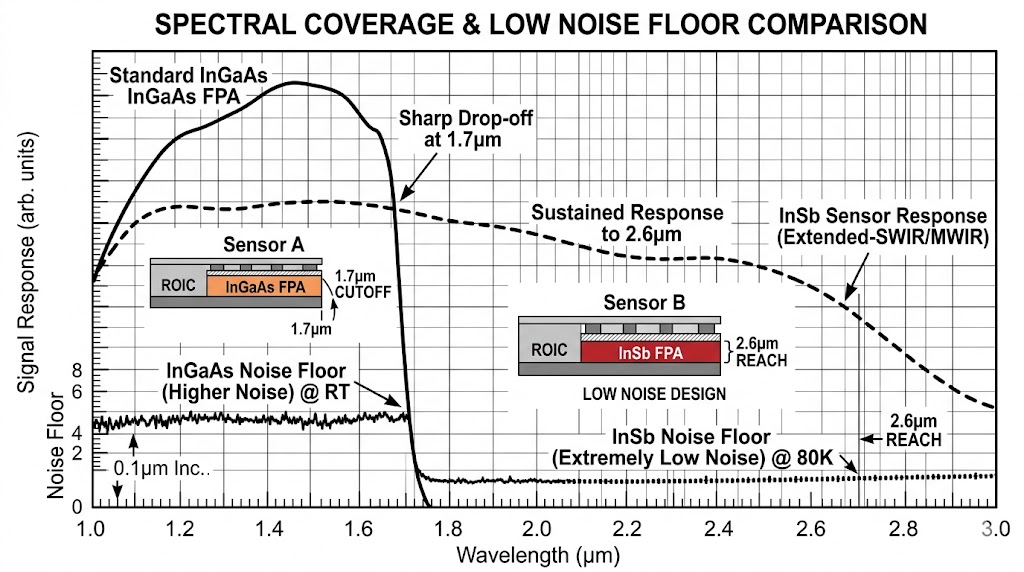 比較標準 InGaAs 與 InSb 感測器:InSb 在 80K 下具有持續至 2.6µm 的響應與極低雜訊,優於 InGaAs 1.7µm 處截止且雜訊較高之表現