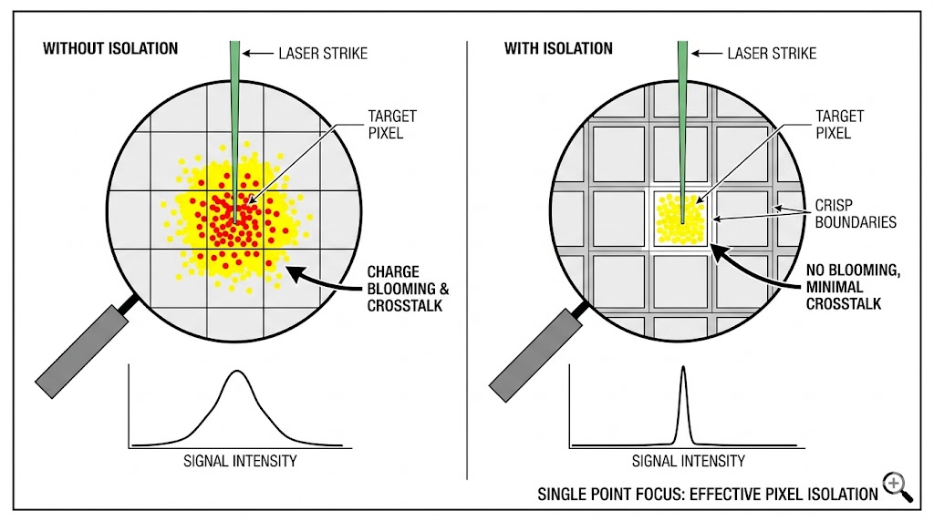 本圖比較像素受雷射照射時:無隔離(左)導致電荷溢出與串擾;有隔離(右)精確侷限電荷,極小化串擾,實現清晰聚焦。