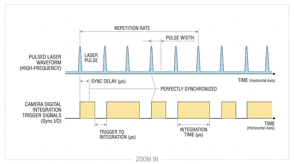 本放大示意圖展示高頻雷射脈衝與相機觸發訊號的完美同步,圖中標示關鍵微秒級參數,包括同步延遲 (Sync Delay) 與積分時間 (Integration Time),強調精確控制。