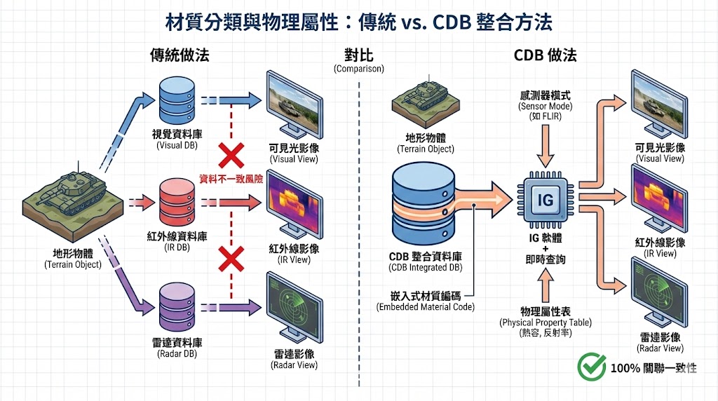 - CDB 做法: CDB 在地形紋理中嵌入了材質編碼(Material Code),當 IG 軟體讀取時,它依據當前的感測器模式(如 FLIR),即時查詢材質的物理屬性(如熱容、反射率),並動態渲染出正確的圖像,這確保了可見光與紅外線視角永遠是 100% 關聯的。
