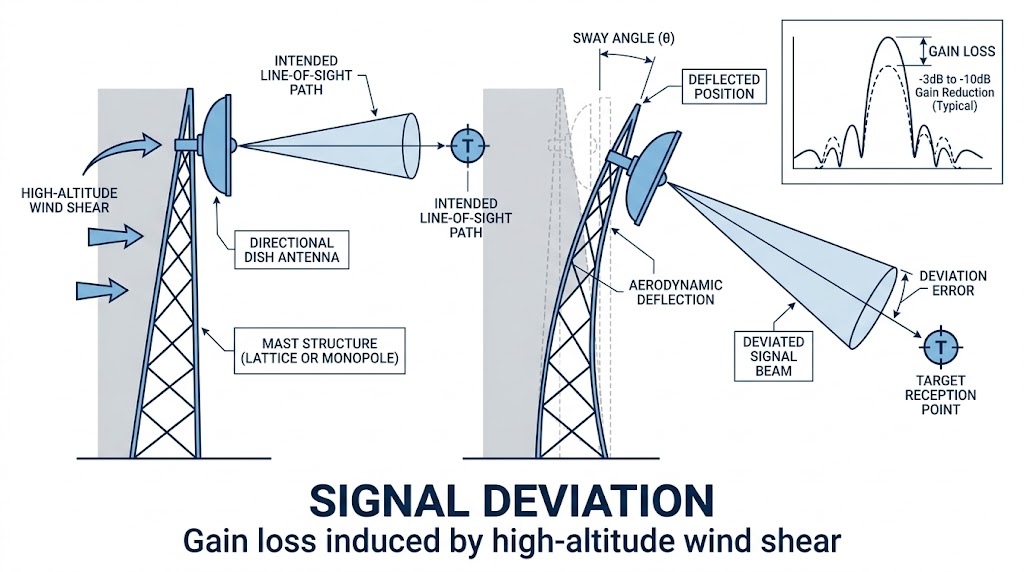 當高達數十公斤的雷達或天線陣列(具有極大的迎風面積)懸掛於桅杆頂端,強勁的高空風切會對整個系統產生巨大的彎矩(Bending Moment),如果桅杆管體的抗彎剛性(Bending Stiffness)不足,頂端就會產生明顯的彈性撓曲。對於高增益的定向天線(Directional Antenna)或長距離光電觀測儀而言,頂端哪怕只有 1 度的傾斜或微幅震盪,都會導致無線電波束偏離接收站,造成數 dB 的訊號衰減(Gain Loss),甚至導致資料鏈路瞬間中斷,這種「氣動撓度」是單靠電子防震演算法無法補償的物理變形,必須依靠精密的管體材料科學與靜態繩索(Guy-rope)張力平衡設計來從根本上克服。