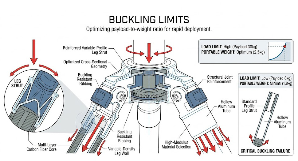 現代戰術任務要求設備具備「高機動性(Man-portable)」,意味著支撐平台的自重必須極輕,且必須採用可快速收折的多節式設計,然而當我們將多節式結構展開至數公尺高,並在頂部放上高達數百公斤的重型武器站或大型觀測儀器時,結構的無支撐長度極大化,而截面積卻受限於便攜性無法無限加大,這會導致系統的臨界挫曲負載大幅降低;工程師在測試場地往往會發現,為了達到單兵可在數分鐘內快速部署的要求,所選用的輕量化管材在面對偏心負載或遭遇強側風時,極易產生微小的彎曲變形,進而破壞整體的靜態平衡,要在「極致輕量、快速部署」與「極端高負載、絕對抗挫曲」這天平的兩端找到完美的力學平衡點,是所有防務硬體設計師面臨的終極挑戰。
