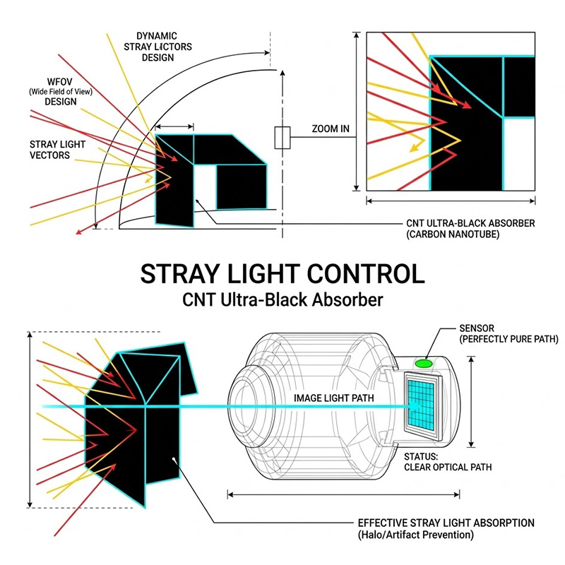 在此精密光學封裝架構下,系統的成像品質已不再單純取決於透鏡的波前像差,而是受制於光學艙內部的「光學雜訊」,任何在視場外(Out-of-Field)的高強度熱源(如無人機自身的馬達廢熱或太陽輻射),一旦進入光學艙並發生非預期的反射,將在焦平面陣列(FPA)上形成無法透過演算法消除的鬼影(Ghosting)與雜散光(Stray Light),為了維持邊緣 AI 視覺辨識的數據純淨度,2026 年的高階軍規光電系統對內部吸收塗層的物理特性提出了極度嚴苛的規範,工程師在實務設計上面臨著三大難以妥協的物理難題。