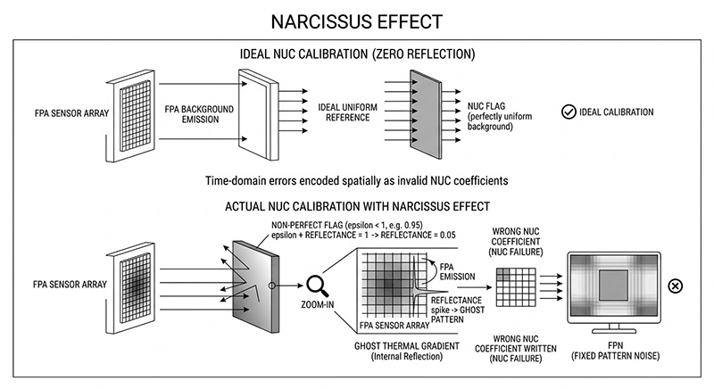 無人機內部的非均勻性校正(NUC)快門(Flag)與感測器周邊的冷屏,必須作為一個絕對的熱力學零點或均勻基準, 若這些元件表面的紅外線發射率未達完美(例如僅有 0.95),代表其具備高達百分之五的反射率,對於極度敏感的 LWIR 感測器而言,這百分之五的反射率會讓感測器「看見」自己陣列散發出的本底熱能,或是反射出電路板運作時的不均勻熱梯度,這種被稱為 鬼影效應(Narcissus Effect)的自我熱反射,會將虛假的幾何熱圖案投射至畫面上,當系統執行自動 NUC 校正時,這些因內部反射產生的幽靈熱梯度會被錯誤地寫入補償矩陣中,導致無人機在觀測平坦背景時,畫面上永遠存在著無法抹除的固定模式雜訊(FPN)。