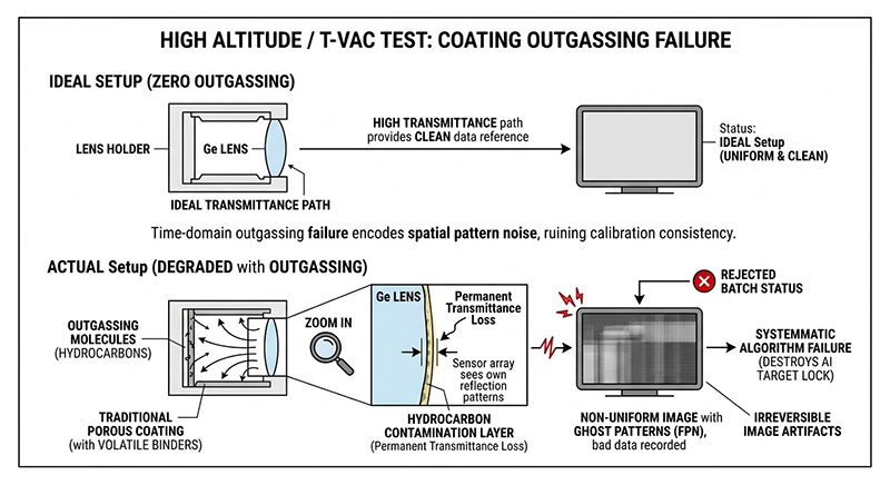 為提升吸收率,許多傳統高發射率塗層依賴極度多孔的微觀結構或高揮發性的化學黏合劑,當無人機進入高空低壓環境,或是進行熱真空(T-VAC)測試時,傳統塗層極易發生釋氣現象(Outgassing),這些揮發出的碳氫化合物分子會重新凝結在低溫的鍺透鏡表面,造成光學穿透率永久下降;另一方面,在面對飛彈發射或無人機高機動飛行產生的高頻震動與數百 G 的衝擊時,傳統多孔厚塗層極易產生微觀碎裂(Particle Fallout, PFO),一旦這些黑色微粒掉落在未封裝的百萬畫素 FPA 上,將形成永久的「盲元(Dead Pixels)」,徹底摧毀這套高價值光電酬載的妥善率;此外高空雲層的水氣若被塗層吸收,更會動態改變遮光罩的熱質量與發射率,讓測試基準變得無法預測。