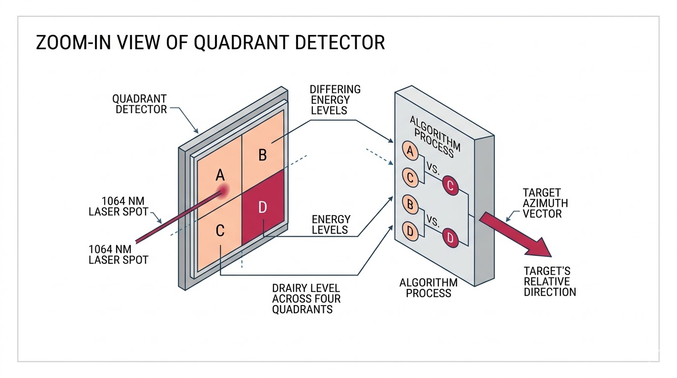 進入 2026 年,半主動雷射 (Semi-Active Laser, SAL) 導引技術在無人載具 (UAV) 與精準打擊飛彈中的應用已達到前所未有的普及,這類武器系統的「眼睛」依賴極度靈敏的「四象限探測器 (Quadrant Detector)」,用於捕捉目標物反射回來的 1064 nm 雷射光斑;而其「大腦」則內建嚴格的演算法,透過計算四個象限接收到的能量差,來推導目標的相對方位並驅動控制翼面。