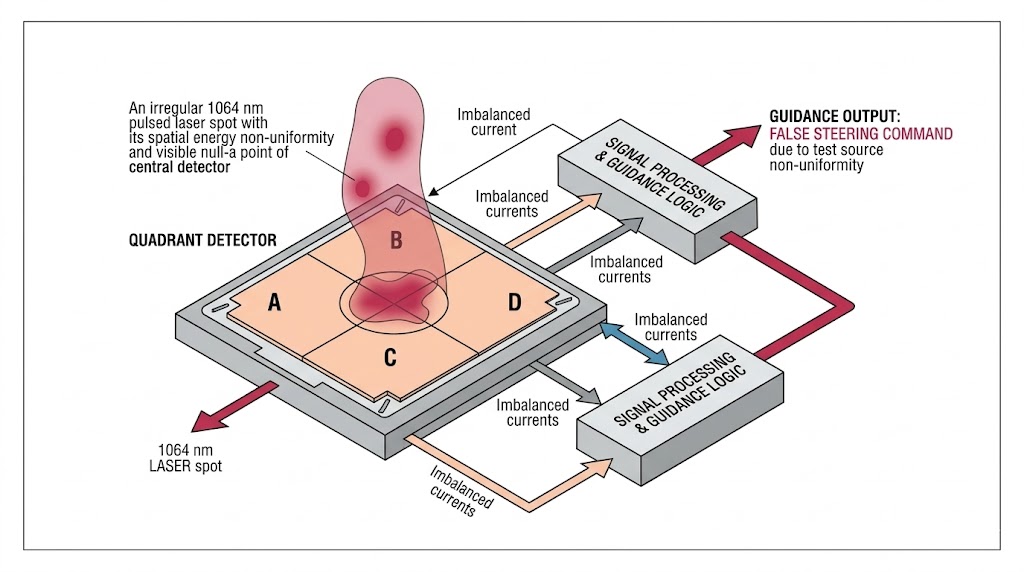 要精確校準四象限探測器的零點 (Null Point) 與線性追蹤範圍,測試系統必須投射出一個波前極度平坦、能量分佈絕對均勻的 1064 nm 脈衝雷射光斑。 如果測試光源 (例如雷射二極體) 的光束輪廓存在熱點 (Hotspots) 或高斯分佈邊緣的畸變,當光斑落在四象限探測器的十字交界處時,不均勻的光子密度會導致各象限產生不平衡的電流輸出。對於導引系統的控制邏輯而言,這種由測試儀器「空間能量不均」所引起的誤差,會被直接誤判為目標正在移動,從而發出錯誤的修正指令(即虛假轉向)。要在大口徑準直儀的光學焦點上產生完美的均勻輻照度,對光學設計構成了極大的幾何挑戰。