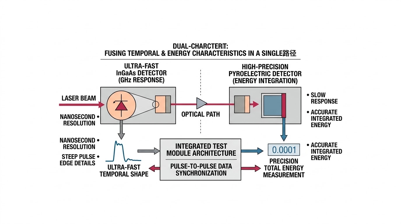 要全面評估一顆雷射的「破壞力與辨識度」,系統不僅需要知道脈衝的「時間形狀 (Temporal Shape)」,更需要知道每一個脈衝所包含的「絕對總能量 (Total Energy)」,在半導體物理中,具備 GHz 級響應速度的光電二極體(如 InGaAs)在量測絕對總能量時存在嚴重的非線性與溫漂問題;而能夠精準執行能量積分的「熱釋電偵測器 (Pyroelectric Detector)」,其時間響應卻過於緩慢,無法描繪奈秒級的脈衝細節。如何在同一個測試模組、同一個光學路徑中,完美融合這兩種物理特性截然不同的偵測機制,並在連續發射數千發雷射的過程中確保脈衝對脈衝 (Pulse-to-Pulse) 的數據同步,是雷射測試設備架構師面臨的終極瓶頸。
