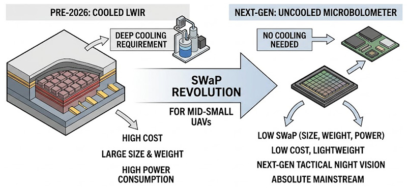 進入 2026 年,無人載具 (UAV) 的夜視與熱成像酬載正面臨一場深刻的硬體革命,過去長波紅外線 (LWIR) 頻段一直由造價高昂、體積龐大且需要深度冷卻的汞鎘碲 (HgCdTe) 陣列、或量子井紅外光電探測器 (QWIP) 所主導,然而為了滿足中小型無人機對「尺寸、重量與功耗 (SWaP)」的嚴苛要求,具備低成本與大陣列優勢的「非致冷微測輻射熱計 (Microbolometer)」已迅速崛起,成為新一代輕量化戰術夜視鏡頭的絕對主流。