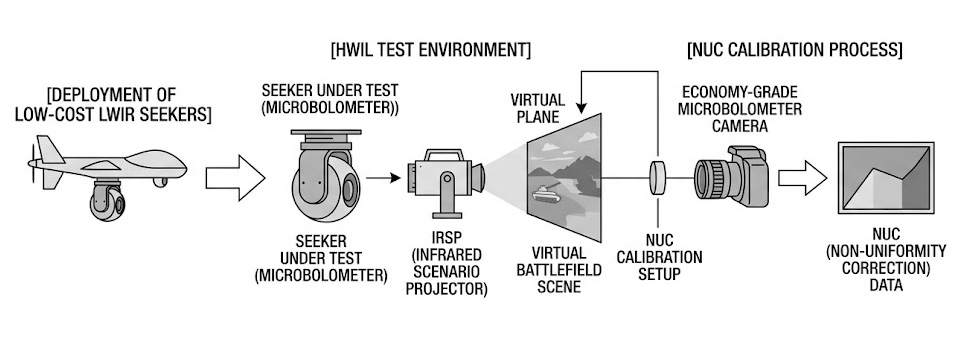 隨著這些低成本 LWIR 尋標器被大量部署,軍工實驗室必須建構對應的硬體迴路 (HWIL) 測試環境,為了校準負責產生虛擬戰場的「紅外線場景投影器 (IRSP)」,測試規範要求必須在與待測物相同的 LWIR 頻段執行極度精密的「非均勻性校正 (NUC)」,理想情況下,實驗室應使用科學級的冷卻型 LWIR 攝影機來執行此校準,但這類設備極度罕見且價格令人望之卻步,因此,測試界轉向使用同樣經濟實惠的微測輻射熱計攝影機來執行 IRSP 的 NUC 校正。