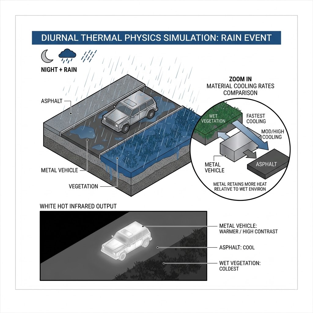 驗證 LWIR 穿透力的靈魂在於 ViXsen 模組,有別於傳統的視覺轉換,ViXsen 是透過材質編碼紋理(Material Coded Textures)進行像素級的底層熱傳導運算,在模擬過程中,它會整合進階天氣模組的數據——當大雨降下或濃霧瀰漫時,ViXsen 會計算空氣中水氣對特定波段(如中波 MWIR 與長波 LWIR)的吸收與大氣散射(Atmospheric Scattering)程度。同時,它也支援動態變化的晝夜循環(Diurnal Cycle),精確呈現日照被厚重雲層遮蔽後,地表物體冷卻速率的差異。透過這套物理機制,系統能真實呈現 LWIR 在濃霧中依然能捕捉微弱熱對比(Thermal Contrast)的物理優勢。