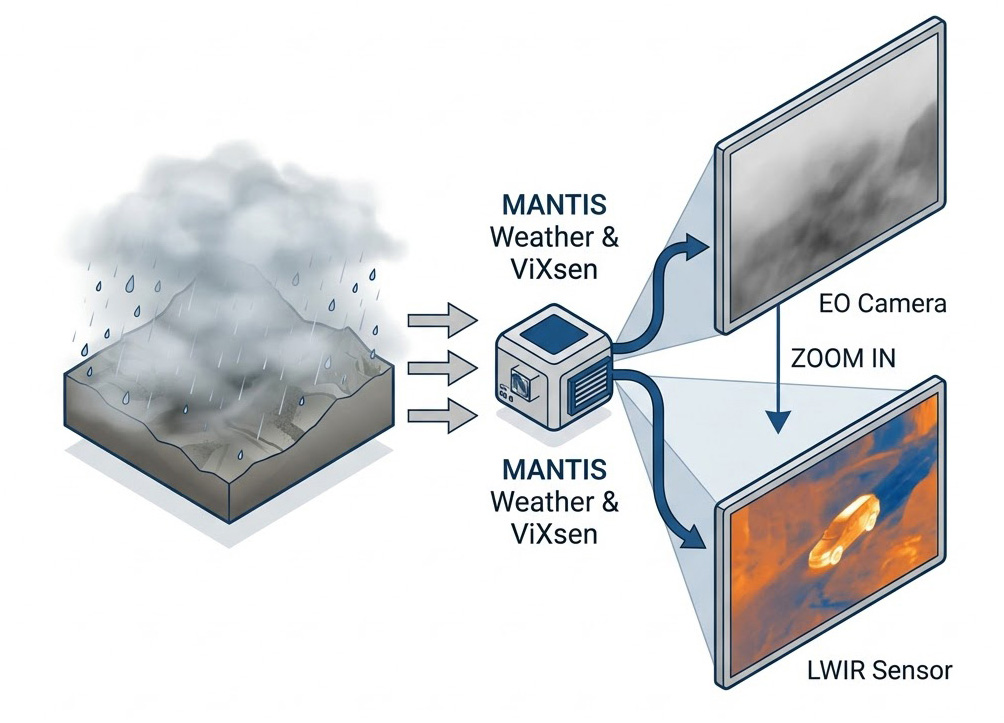 在現代航太與國防產業的發展進程中,無人飛行載具(UAV)的應用已從早期的「晴天日間作業」大幅演進為「全天候、全天時」的戰術與巡航需求,在這樣的背景下,無人機所搭載的感測器能力,成為了決定任務成敗的核心樞紐,在良好的天候下,高解析度的電光(Electro-Optical, EO)可見光相機足以應付多數的偵蒐任務;然而,當面臨大雨、降雪、甚至濃霧等極端天候時,可見光與短波紅外線(SWIR)往往會因為空氣中懸浮水滴與微粒的散射效應而產生嚴重的視覺退化,導致「致盲」現象。