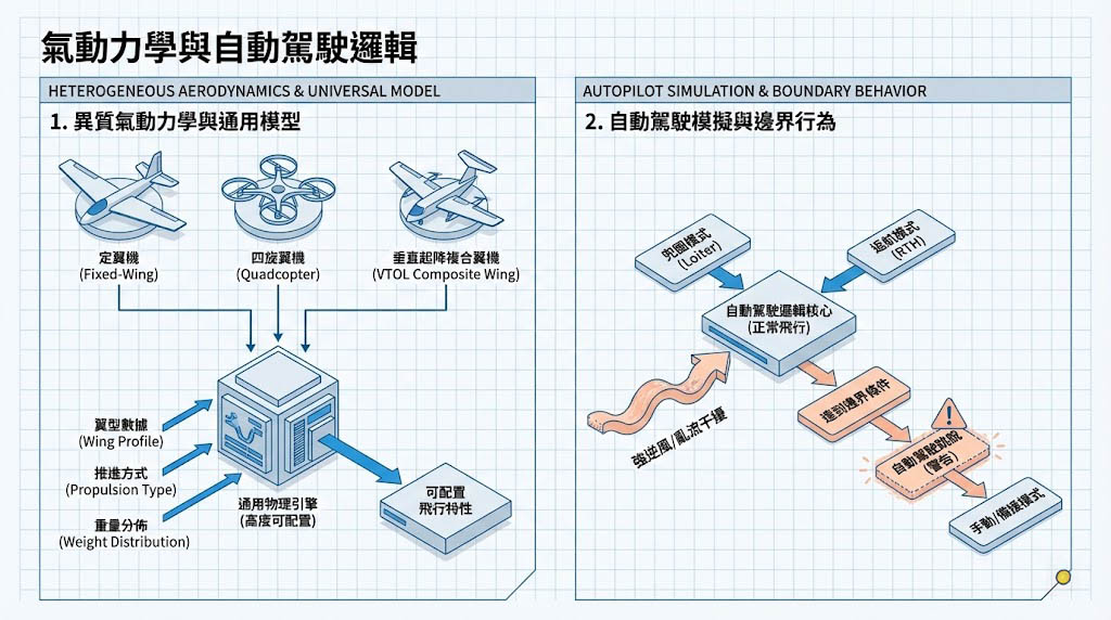 1. 異質氣動力學與自動駕駛邏輯 (Aerodynamics & Autopilot)