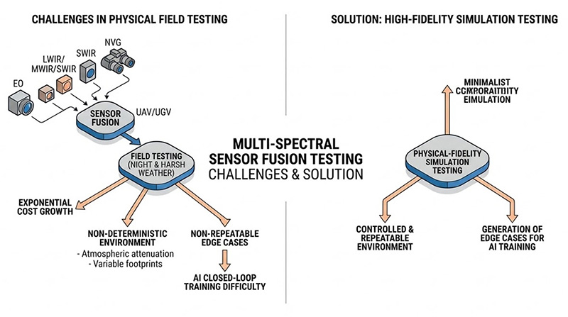 這種測試之所以越來越嚴格,主因在於現代無人機與無人車高度依賴多光譜感測器融合(Sensor Fusion)技術,包含電光(EO)、長波/中波/短波紅外線(LWIR/MWIR/SWIR)及微光夜視(NVG),在實體場域進行高頻次的夜間與惡劣氣候試飛,不僅成本呈現指數型增長,其環境參數(如大氣衰減、目標熱足跡變化)更具備不可重複性(Non-deterministic),導致 AI 影像辨識與目標追蹤演算法無法獲得足夠的邊緣案例(Edge-case)進行閉環訓練,因此具備高物理保真度(Physical Fidelity)的感測器模擬測試,已成為驗收前無可迴避的強制性合規途徑,然而,在實務執行上,測試工程師正面臨三大難題。