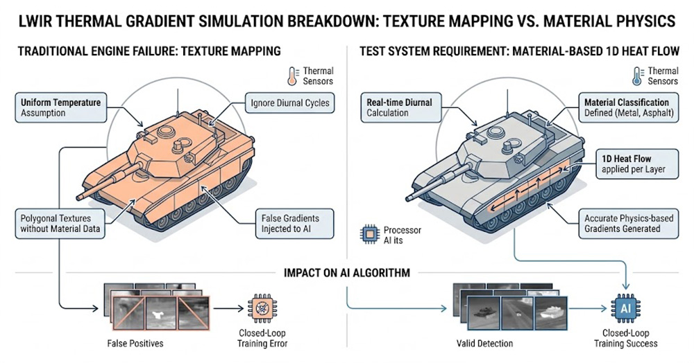 現代 AI 影像演算法對紅外線波段的梯度變化極為敏感,傳統基於多邊形紋理貼圖的視覺引擎,無法運算基於物理材質(Material Classification)的精確熱傳導與熱消散現象,工程師在測試長波紅外線(LWIR)模組時,必須要求測試系統能即時計算環境中不同材質(如金屬、植被、瀝青)在日夜交替(Diurnal Cycle)下的 1D 熱傳導方程,若模擬器無法精準渲染 16-bit 高動態範圍(HDR)的熱輻射特徵,將導致系統注入的虛擬熱點訊號失真,進而使 AI 追蹤演算法產生嚴重的誤判(False Positives)。