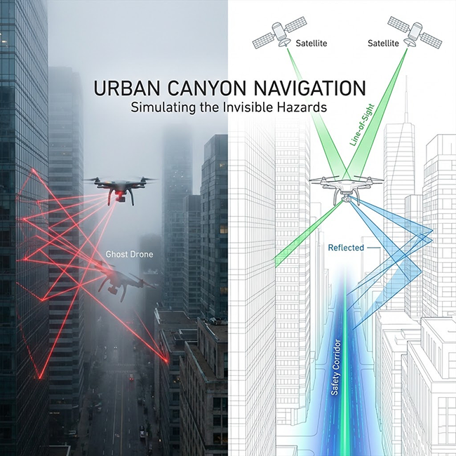 「低空經濟」正從概念走向現實,未來的城市天際線將布滿執行外送、巡檢甚至載人任務的無人機(UAV),然而當飛行場域從開闊的農田轉移到鋼筋水泥叢林時,衛星導航系統(GNSS)面臨了物理學上的終極考驗:城市峽谷(Urban Canyon);在開闊地帶,GPS/GNSS 的定位精度可達公尺級甚至公分級(RTK),但在高樓林立的市中心,定位誤差可能瞬間暴增至數十公尺,對於在建築物間穿梭的無人機而言,5 公尺的誤差就可能意味著撞擊大樓或墜落人群,這不是接收機壞了,而是訊號「迷路」了。