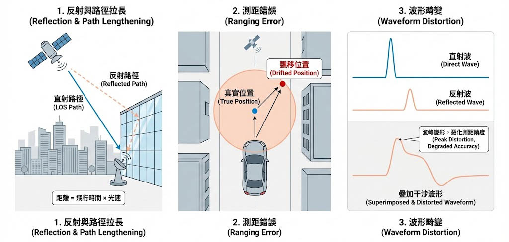 當直射波與反射波同時到達(例如從地面反射),兩者會疊加干涉,導致相關器(Correlator)追蹤到的波峰變形,進一步惡化測距精度。