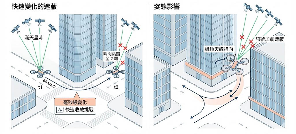 無人機以時速 60 公里飛過街角,衛星的可見性會在毫秒級內發生劇烈變化(從滿天星斗瞬間變成只剩 2 顆),導航濾波器(如卡爾曼濾波)需要極快的收斂速度才能適應這種跳變。 - 姿態影響:
