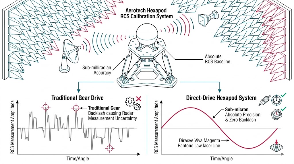 示意圖為 RCS 校正系統位於電波無迴響室內,圖中對比傳統齒輪驅動 (左) 的背隙導致雷達測量雜訊與不確定性,以及直驅六軸並聯運動平台 (右) 的次微米絕對精度與零背隙,滑順呈現絕對 RCS 基準。
