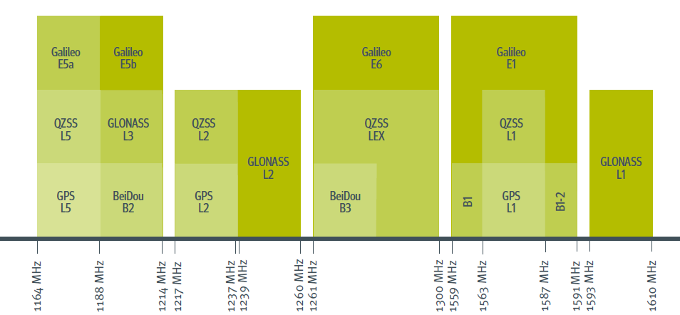 GNSS+IMU耦合系統中的GNSS部分需處理來自多個星座、多個頻段的複雜訊號(如圖所示的GPS L1/L2/L5, GLONASS L1/L2/L3, Galileo E1/E5a/E5b/E6, BeiDou B1/B2/B3等),模擬器需要能準確再現這些訊號特性,而耦合演算法也需能有效融合這些多樣化的觀測數據。