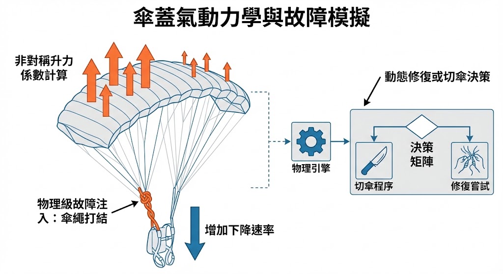 系統必須計算傘衣在不同攻角下的升力與阻力係數,更關鍵的是「故障注入(Malfunction Injection)」技術。