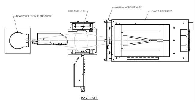 此光線追跡 (Ray Trace) 示意圖,描繪紅外輻射從 SBIR 4100 腔體黑體發出後的光路,光線通過光圈輪選定光孔,穿過聚焦透鏡組 (Focusing Lens),最終匯聚投射至杜瓦瓶 (Dewar) 內的焦平面陣列 (FPA);此圖呈現了黑體腔體、光圈、透鏡的相對位置,以及透鏡如何將紅外線精確聚焦至感測器平面上,是分析聚焦模式 (Focus Mode) 測試中光學配置與能量傳遞的重要參考。
