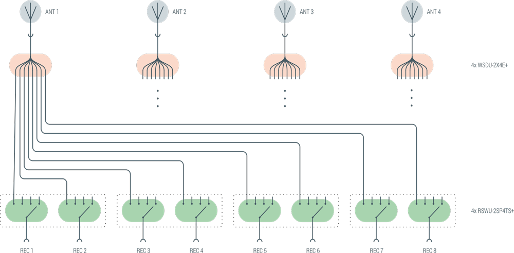 4 組天線輸入透過 WSDU-2X4E+ 主動多耦合器模組,可等電平分配至 8 組輸出埠,不產生訊號損失;每一組接收端輸出則配置 RSWU-2SP4TS+ SP8T 射頻開關模組,可在任一輸入天線間靈活切換,實現真正非阻斷式訊號選擇。