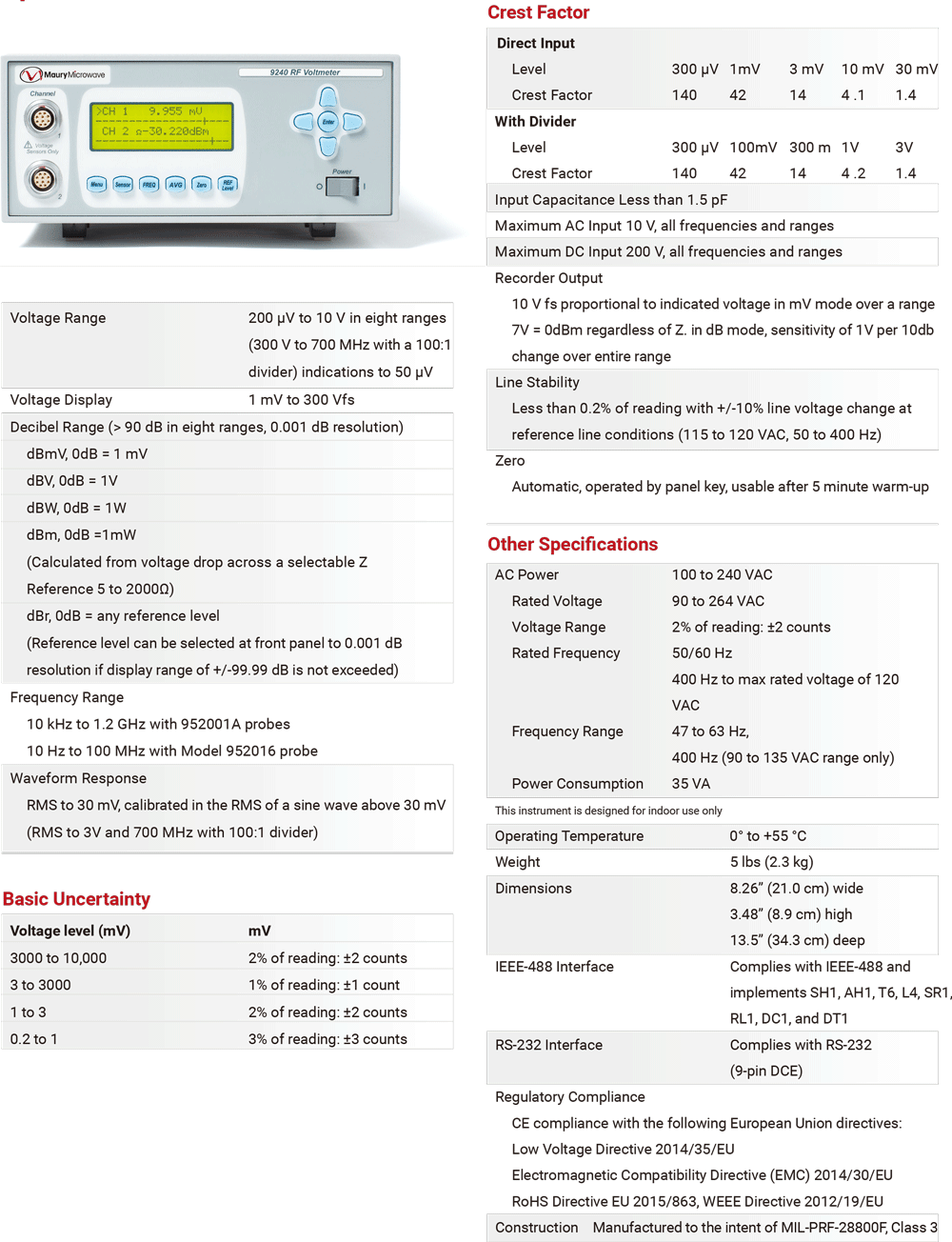 9240 系列結合了高準確度、智慧探棒、與操作功能,這些特性在同等價位產品中前所未有,無論是用於工作台量測,或是整合至自動測試設備(ATE)系統中,皆可輕鬆應用;Boonton 可靠的電壓探棒可直接量測 200 μV 至 10 V,最低可顯示 50 μV,且在 30 mV 以下具備 真均方根值(True RMS) 響應能力;此外,內建 100:1 除法器可支援最高 300 V 的操作。