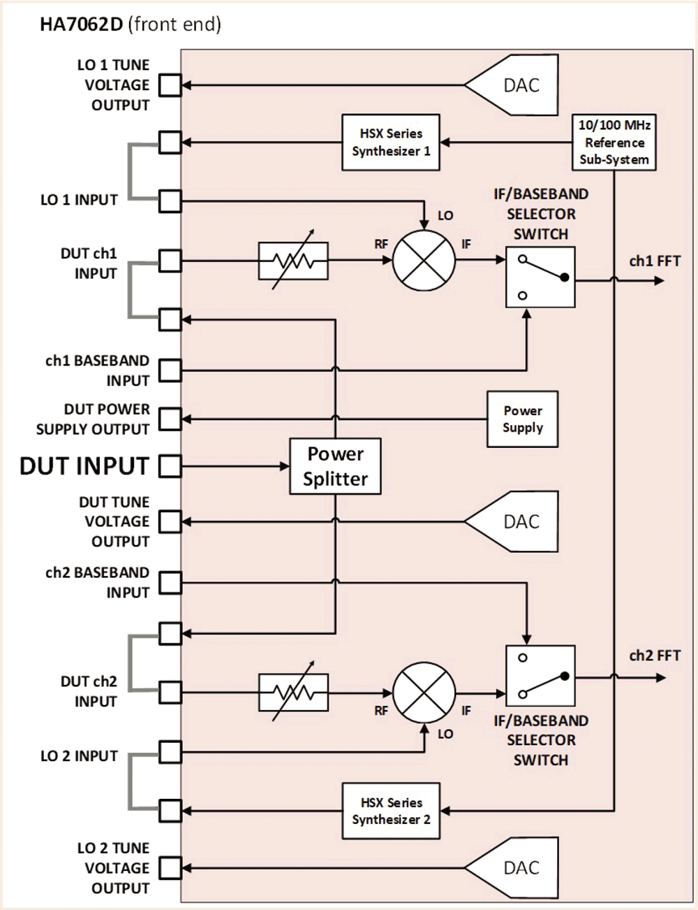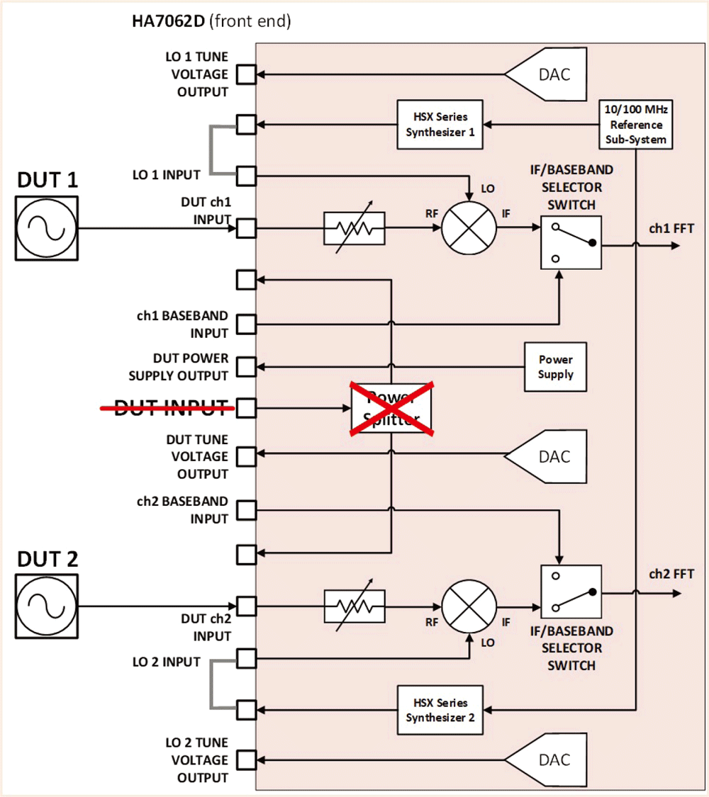 為了精確量測底層雜訊,HA7062D 採用特殊的內部架構,允許繞過內部功率分配器(Power Splitter),使用者能夠直接存取各通道的相位檢測器(混頻器, Mixer);這樣一來,便可在目標頻率下測試來自兩個不相關頻率源的相位雜訊,進而獲得更真實、可靠的資料,請參考下圖了解具體配置。