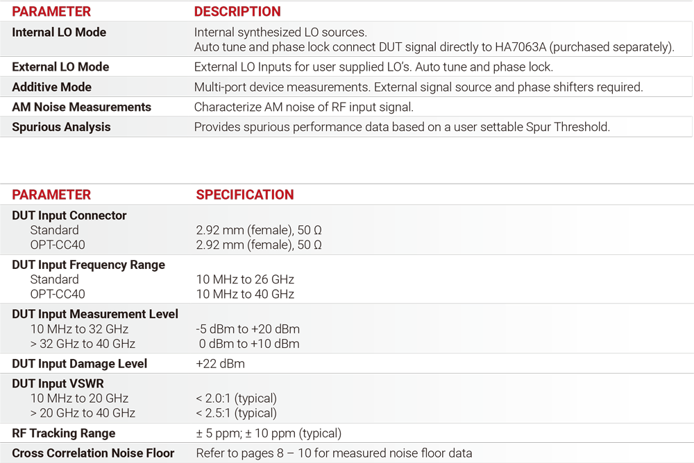 - 量測項目:獨立的調幅(AM)/ 調相(PM)、基頻(Baseband)、雜散(Spurious)、抖動(Jitter)