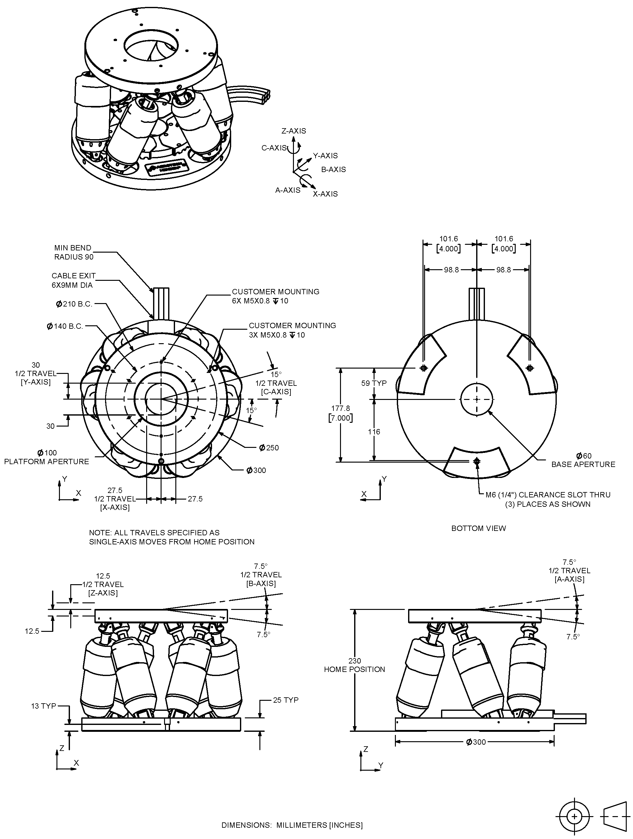 HEX300-230HL 的模組化設計提供極高的靈活性與客製化選項,使用者可根據特定應用需求調整平台與底座,例如:自訂安裝模式、介面規格、及附加功能;其平台中央開孔直徑達 100 mm,底座開孔直徑為 60 mm,底部開放結構,支援更便捷的工件操作,底座的安裝孔設計相容於英制與公制光學桌,確保高度相容性。